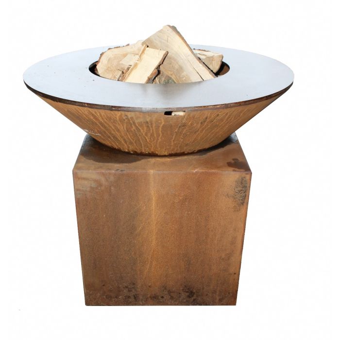- Dieser Feuertisch aus Cortenstahl hat ein stilvolles Design (eine kegelförmige Feuerschale